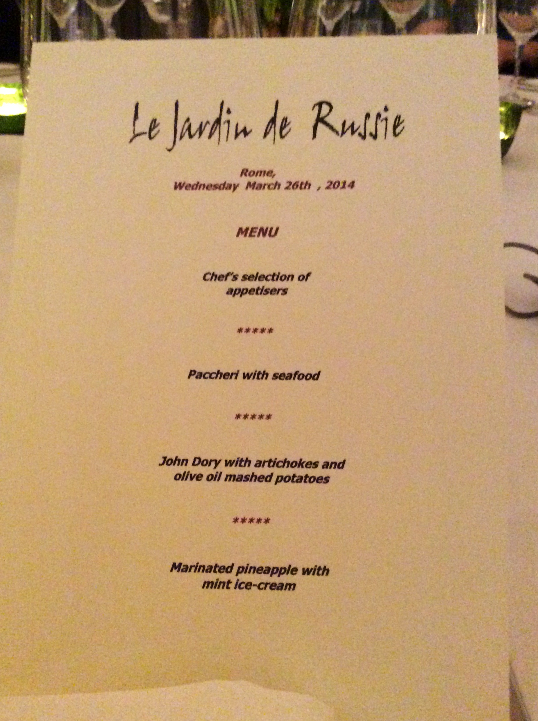 Spectacular Dinner Posted on March 30, 2014 by Catherine Whitworth Cuisine in Italy is on a level above anything in the world. Only using the freshest and most colorful ingredients, food is the ultimate highlight at Hotel De Russie. img 1648 Share this: Click to share on Facebook (Opens in new window) Facebook Click to share on X (Opens in new window) X Click to share on Pinterest (Opens in new window) Pinterest Click to share on LinkedIn (Opens in new window) LinkedIn Click to email a link to a friend (Opens in new window) Email Click to share on Tumblr (Opens in new window) Tumblr Like Loading... Related